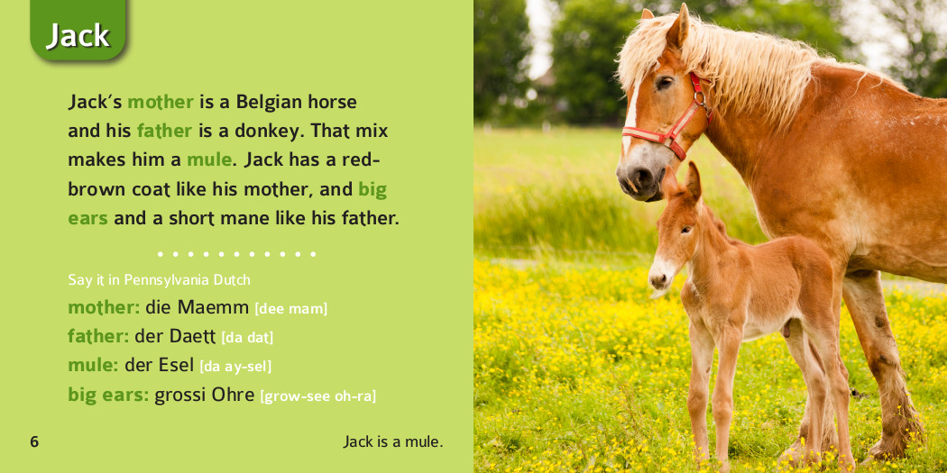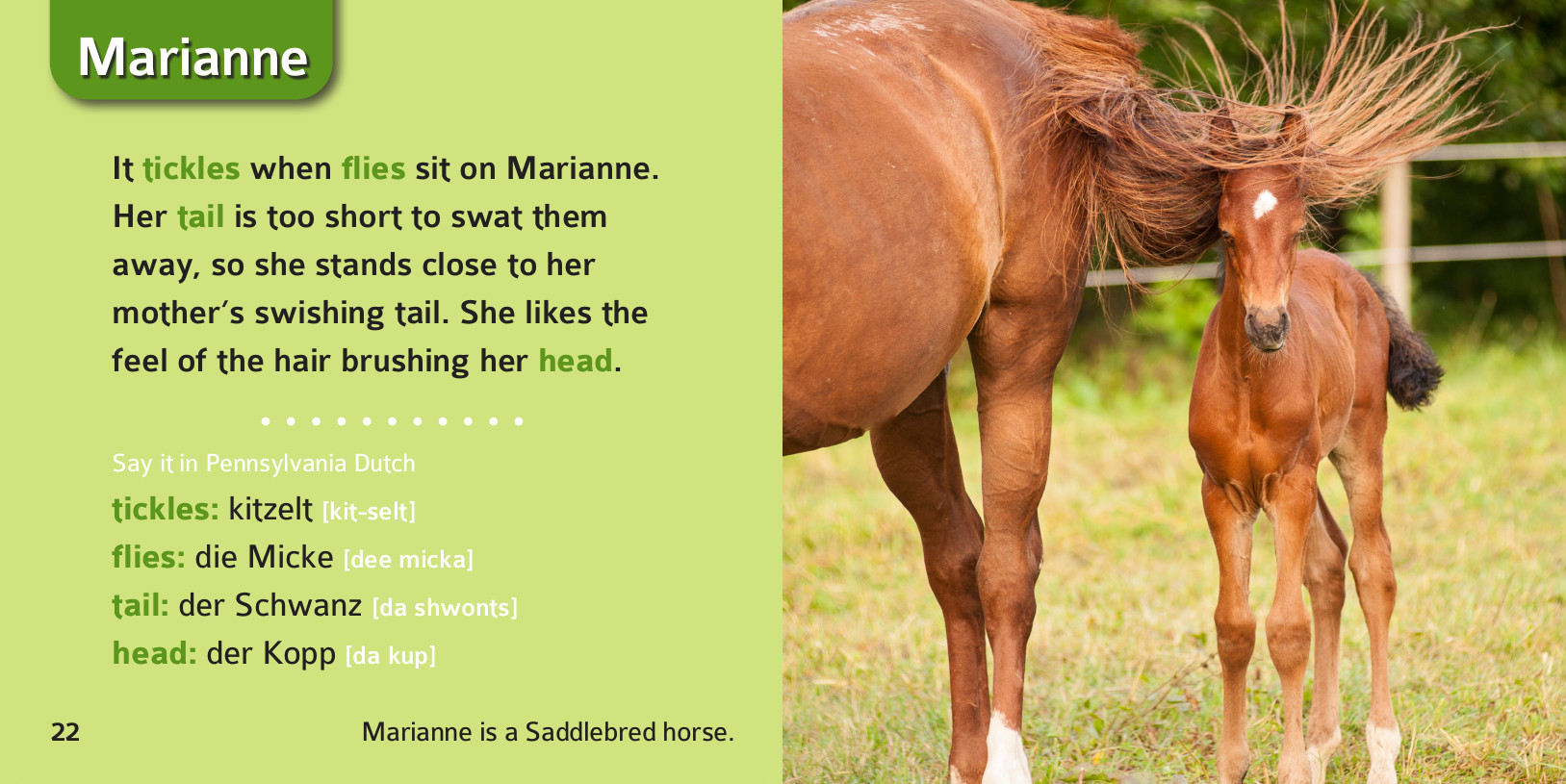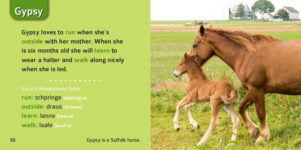 “Mares & Foals is really beautiful, and the photos are gorgeous. There is just enough language for young children. The layout is simple and lovely. And I love the addition of the Pennsylvania Dutch vocabulary.”